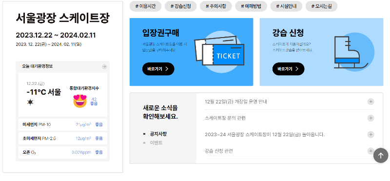 누리집에서 온라인예매도 가능하며, 강습신청도 가능합니다.도심 한복판에서 운영되는 야외 스케이트장인 만큼, 시민의 건강을 최우선으로 보호하기 위해 초미세먼지가 일정 수준 이상일 경우 운영을 중단하며, 대기오염도는 시민들의 이동시간을 고려해 사전에 확인할 수 있도록 누리집을 통해 실시간 공지할 예정입니다.
