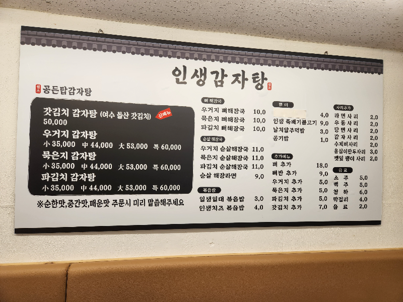외대 맛집 인생감자탕의 메뉴입니다.