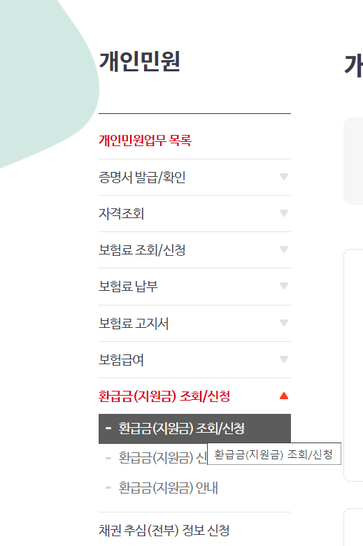 2. 건강보험 공단 홈페이지에서 개인민원으로 들어가서 환급금(지원금) 조회/신청을 누릅니다.