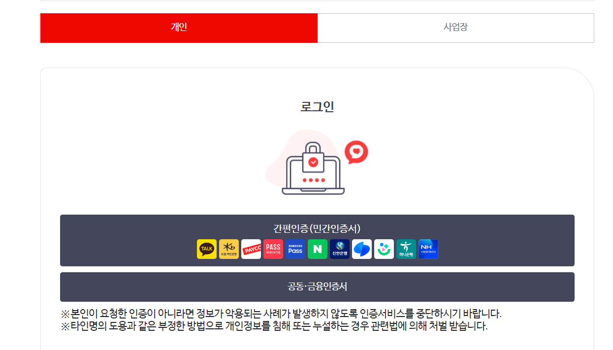 3. 공동인증서, 금융인증서 또는 간편 인증으로 본인 확인을 해줍니다.