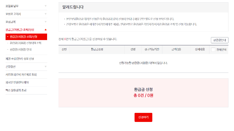 저는 이렇게 신청이 가능한 환급금이 없어서 총 0건 / 0원이라고 뜹니다.